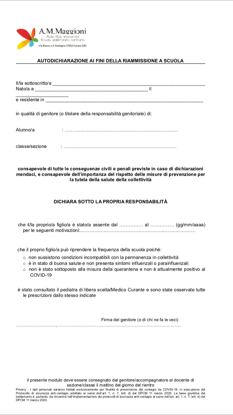 Scarica qui l'autocertificazione per il rientro (dopo assenza) a scuola del bambino, compilala e consegnala all'insegnante/educatrice di riferimento